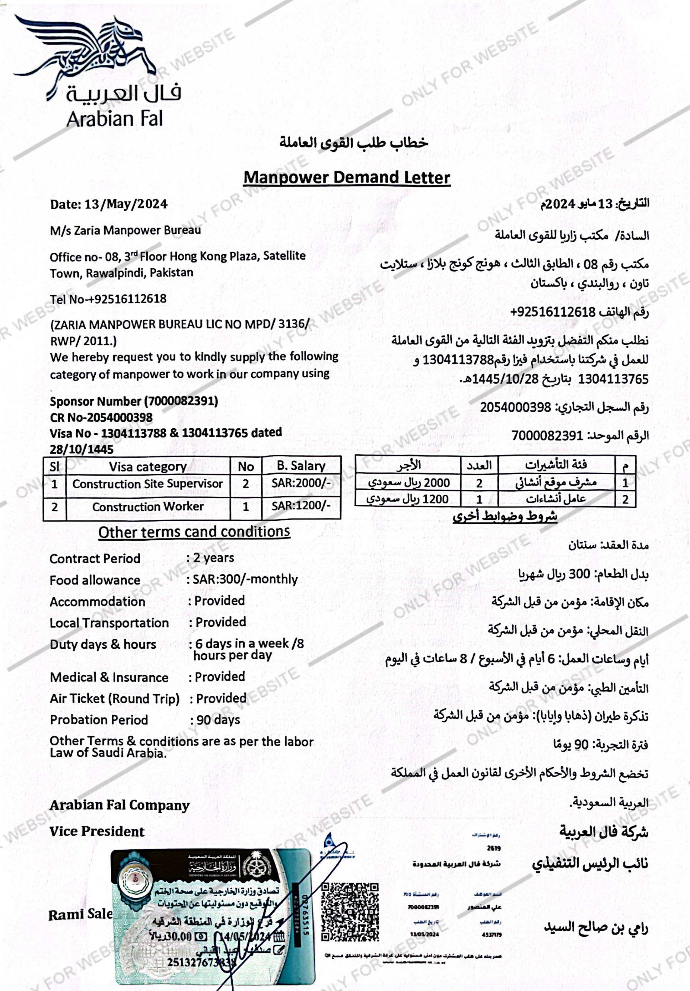 Employer/Principal Company will formally issue a demand letter in favor of the Zaria Overseas Employment Promoters.